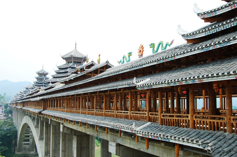 Chengyang Wind and Rain Bridge is a bridge located in Sanjiang County, Luizhou, Guangxi Province. The bridge is a covered bridge which was completed in 1916 and spans a total of nearly 65 meters in length. It crosses the river in the village of Linxi Ma’an. Built of wood in five stacks of stone, was completed in 1916 . Each stack is topped by a tower to the appearance of pagoda. The structure is more than just a useful bridge, it includes a series of shaded pagodas, corridors, verandas, relaxing benches and nowadays a souvenir market.